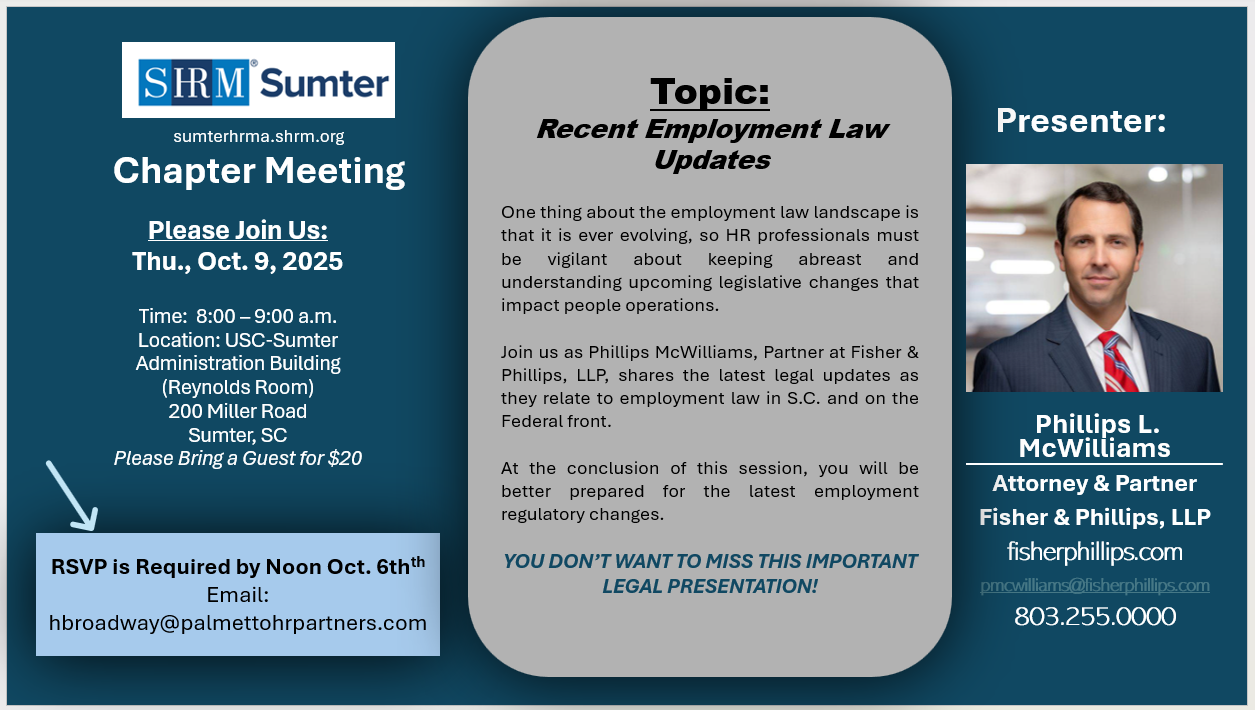 Our guest speaker this month will be Phillips McWilliams of Fisher Phillips law firm. Phillips will provide us with some employment law updates. You don't want to miss this informative meeting!